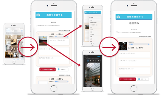 - 静止画で撮影した写真も、現場で編集・ポータルへアップロードすることが出来ます。