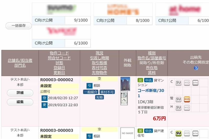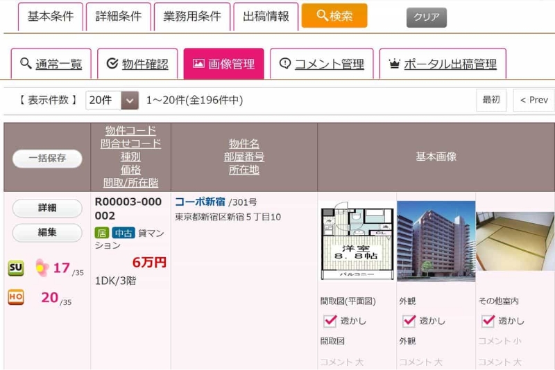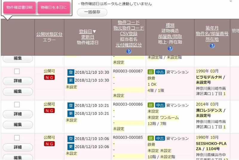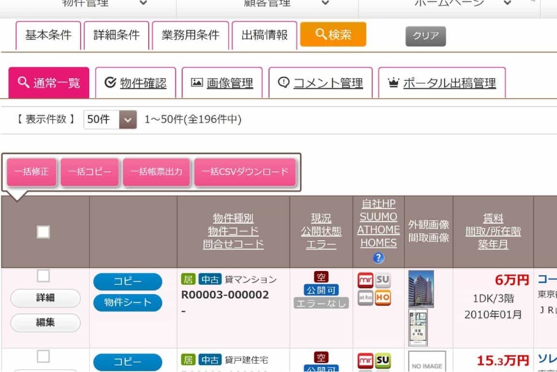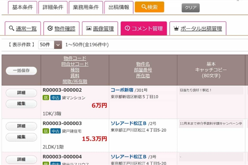 物件情報の検索では、面積や価格などでの検索だけでなく、掲載状態のエラーや物件更新者など業務で使える検索が充実しています。細かな検索条件が指定できるので、修正したい物件を手作業で探す必要はなく、すばやく目的の物件を見つけられます。無駄な作業時間を減らす効果の大きい機能です。